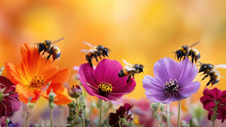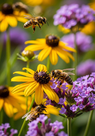 A captivating scene of busy bees pollinating vivid flowers in a lush garden, showcasing the delicate balance of nature and the beauty of wildlife.