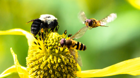 Two honeybees hover in flight near a bright yellow flower with vibrant green foliage in the background. The focus is on the intricate details of the bee's wings, body, and the flower's petals.