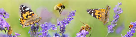 honeybee,butterfly and lady bud on lavender flowers in panoramic view