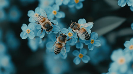 This stunning close-up showcases bees interacting with lovely blue flowers, illustrating the beauty of nature and the vital role of pollinators in our ecosystem.