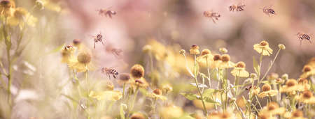 Abstract photo of a blurred background of a yellow flower field. Bumblebee on the flower. Garden blooming