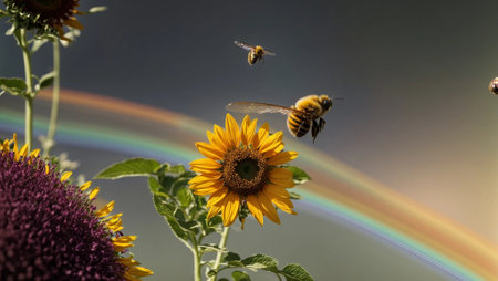 An AI generated illustration of a group of bees flying near vibrant flowers and a colorful rainbow arching in the background