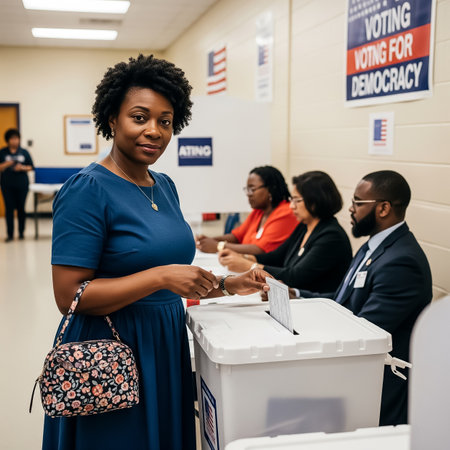 A woman in a blue dress stands by a ballot box, preparing to vote. In the background, election officials assist voters in a busy polling station, highlighting civic engagement.