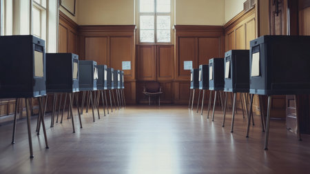 Empty voting room features booths set up with clear instructions, maintaining an institutional atmosphere that promotes focus and tranquility during voting.