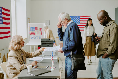 Queue of intercultural voters standing by desk of electoral commission while one of them taking ballot paper with list of candidates