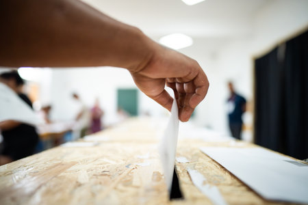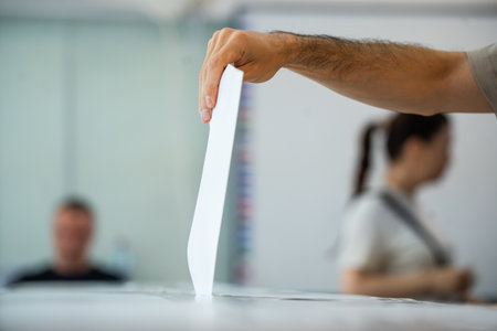 Hand of a person casting a ballot at a polling station during voting.