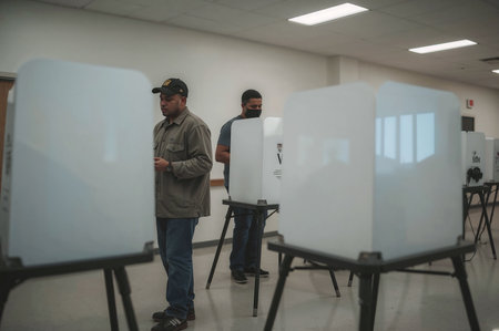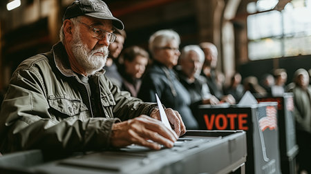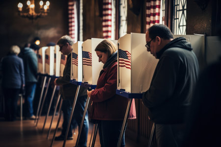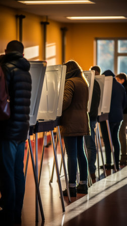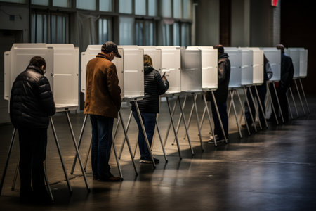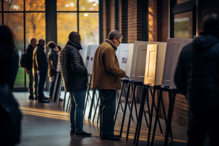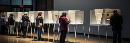 USA citizens line up to exercise right to vote. The election day fervor is palpable at the vote center office, where voters await their turn to enter the voting booths adorned with American flags.