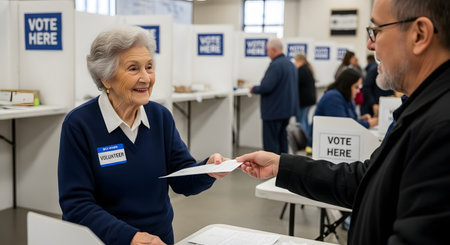 A smiling, elderly female volunteer with a 'VOLUNTEER' name tag hands a ballot to a voter at a polling place. The station has 'VOTE HERE' signs and voting booths visible in the background.