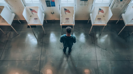Two people cast their votes at booths in a brightly lit polling station. A civic duty in progress demonstrating voting participation and electoral process.