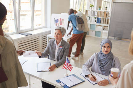 High angle view at multi-ethnic group of people registering for voting at polling station decorated with American flags, copy space