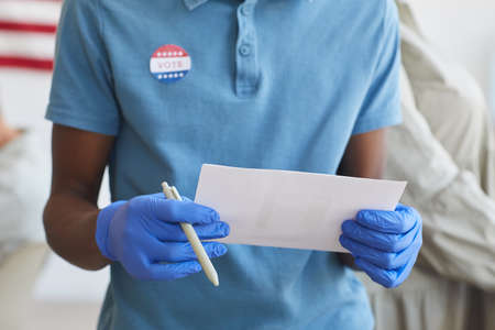 Cropped portrait of unrecognizable African-American man holding ballot and standing by voting booth on post-pandemic election day, copy space