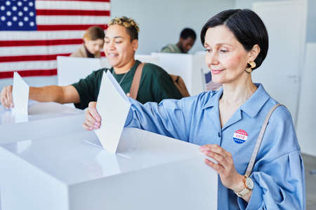 Portrait of smiling American woman voting and putting ballot in bin on election day