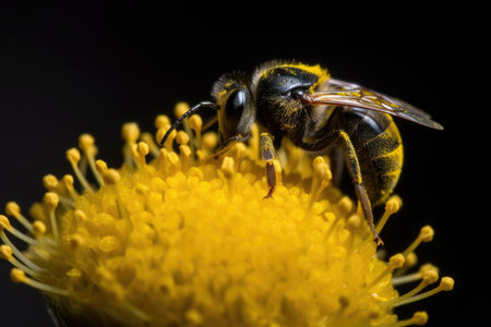 Busy honey bee picking up pollen from yellow flower blossom generated by artificial intelligence