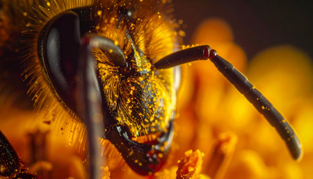In a world of vibrant gold, a diligent honeybee performs its vital task. This extreme close-up reveals the intricate details of its form, dusted with life-giving pollen, capturing a moment of intense focus and the delicate balance of the natural world.