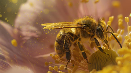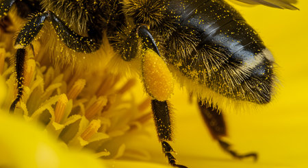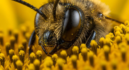 Macro view of a busy bee covered in golden pollen foraging on a vibrant yellow flower