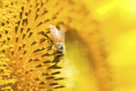 Close-up detail of a yellow sunflower hellanthus annuus honey bee apis collecting pollen in garden