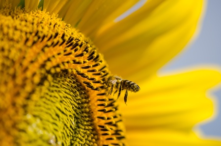 Bee on sunflower. Flower of sunflower close-up, natural background.