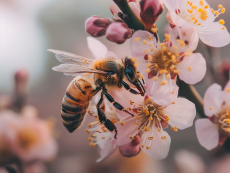 Close-up of a bee hovering near blooming pink blossoms under soft sunlight, vintage photo