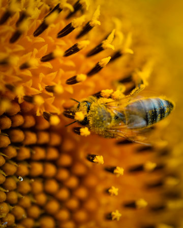 A stunning close-up of a bee gathering pollen from a vibrant sunflower. This image captures the intricate details of the bee and petals, showcasing nature's beauty.