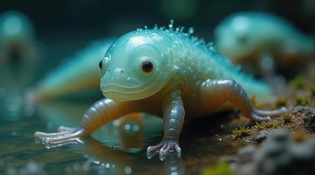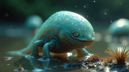 A fascinating creature with a smooth body and sparkling spots rests on the wet ground near a serene pond, showcasing its vibrant colors while tiny plants grow nearby.