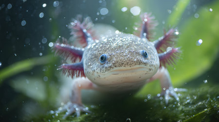 An axolotl explores its vibrant aquatic environment, surrounded by light bubbles and clear water, creating a serene underwater setting.
