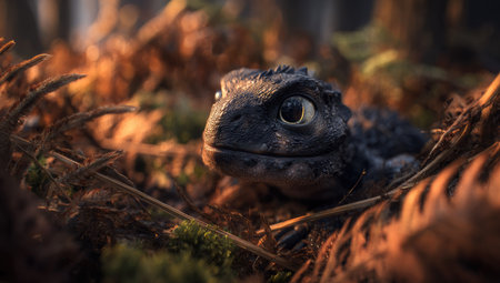 A detailed image displays a small lizard resting in a bed of brown leaves and soil. The lizard features dark skin and large eyes. The lighting creates a warm atmosphere, emphasizing the natural textures of the environment. Suitable for editorial and commercial applications.