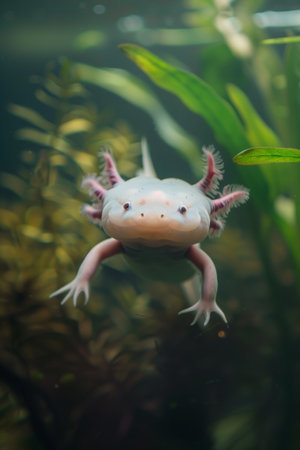 Captured in a natural aquarium, the axolotl appears floating among lush green aquatic plants. Its pale color and feathery gills create a sense of peace in its aquatic habitat.