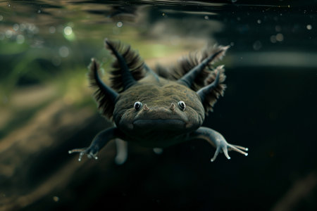 Captured underwater, an axolotl with dark coloration and feathery gills gracefully moves in the water. Its cute facial expression enhances the charm of this aquatic amphibian in its natural habitat.