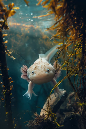 A curious axolotl swims through a lush underwater scene. The amphibian is centered within vibrant plants, showcasing its unique features in its natural habitat of the aquarium.