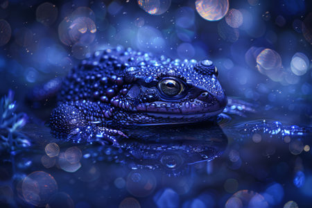 Blue frog on a dark blue background with bokeh effect.