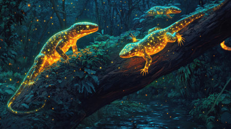 In a mystical forest at night, glowing salamanders traverse a mossy log surrounded by radiant plants and a tranquil stream. The enchanting scenery captivates all who gaze upon it.