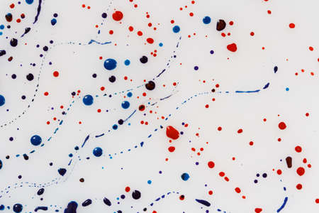 divorces and paint drips red, orange, yellow, blue blurred abstract background on a white paper background plane surface close-up macro with filter toning effect