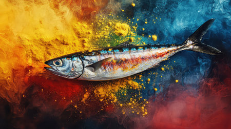 Stunning image of a vibrant fish displayed against a backdrop of colorful splashes of yellow, blue, and red, highlighting its fresh appeal and beauty.