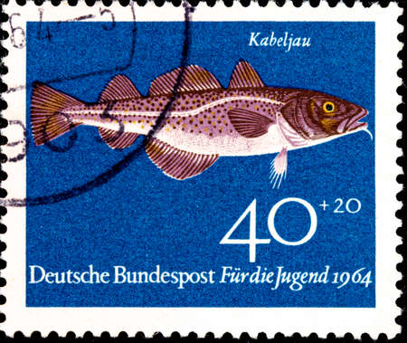 02 10 2020 Divnoe Stavropol Territory Russia postage stamp Germany 1964 Youth Health - Fish Gadus morrhua Atlantic Cod fish on a blue background