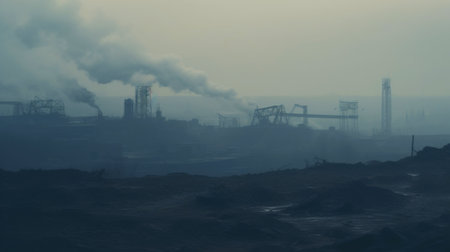 Coal mining industrial landscape. Heavy pollution, smoke, dust, ruined ecosystem. Generative AI.