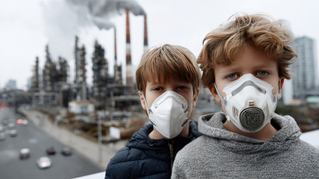 Two young boys wearing protective masks stand in front of a smoke-filled industrial landscape. Their expressions reflect concern for air pollution and the environment.