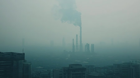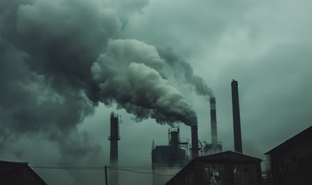 tall smokestacks emit thick smoke, polluting air over industrial area, environmental concern. atmospheric contamination evident over urban landscape