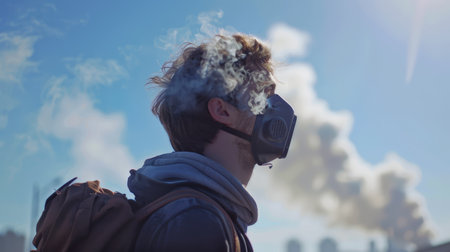 A man wearing a gas mask is standing in front of a cloud of smoke. Concept of danger and urgency, as the man is trying to protect himself from the harmful effects of the smoke