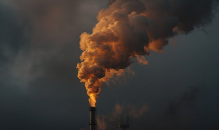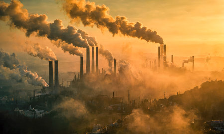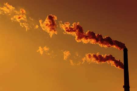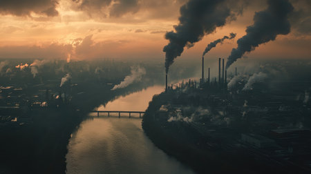 Chimneys release thick smoke into the evening sky, creating a striking contrast against the sunset. The industrial landscape highlights pollution.