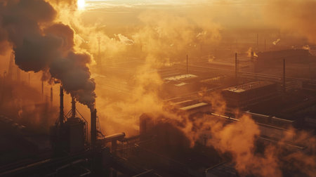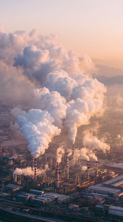 An aerial view shows industrial smokestacks releasing large clouds of emissions. The image features soft, diffused light and warm colors like orange and yellow, suggesting either sunrise or sunset. The composition emphasizes the contrast between natural light and manufactured smoke. Suitable for environmental or climate change related projects.