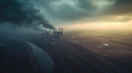 industrial power plant emitting thick plumes of co2 smoke from towering chimneys contributing to air pollution and global warming.