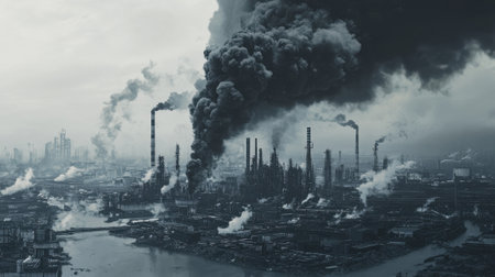A dense layer of smog envelops a modern metropolis, with factories silhouetted on the horizon above a contaminated river full of plastic waste.