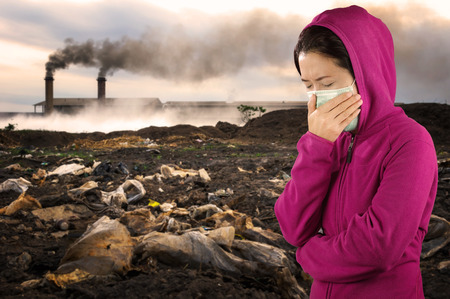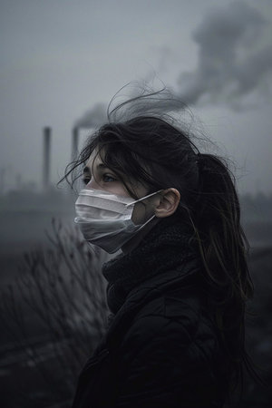Young girl with face mask, emphasizing air quality issues, industrial landscape filled with smoke