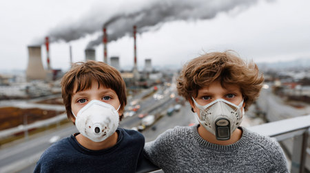 Two young children wearing protective masks stand together, displaying concern for pollution in an urban setting filled with factories.