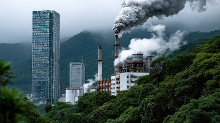 A striking industrial scene featuring a smoking factory juxtaposed with a modern skyscraper, surrounded by lush greenery and mountains under a cloudy sky.