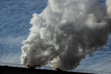 Environmental problem, environmental pollution, smoke from the pipe of an industrial plant or thermal power plant against a blue sky.