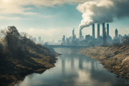 Industrial plant emitting toxic smoke into the atmosphere, polluting the surrounding environment and water with garbage