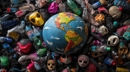 This powerful image depicts a colorful globe overshadowed by plastic waste, illustrating the urgent need for environmental awareness and action against pollution.