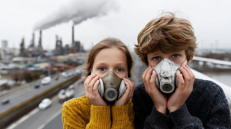 Two children stand in front of an industrial site, wearing protective masks, highlighting the urgent issue of air pollution and environmental health.