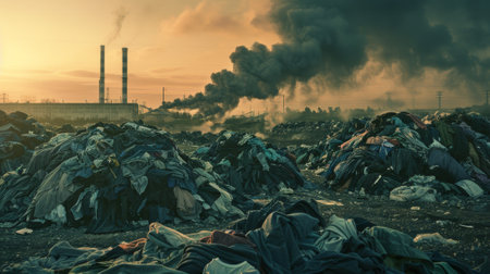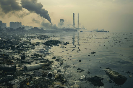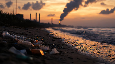 A Polluted beach with plastic waste and smoke from nearby factories at sunset